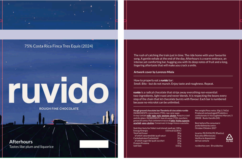 Die Tafel vermittelt ein Gefühl von Ruhe und Geborgenheit: Ein kleiner, intensiver Genuss, der an die Vorfreude erinnert, den Zug gerade noch zu erreichen oder die Rückfahrt mit dem Lieblingssong zu genießen. Afterhours ist wie eine warme Umarmung – intensiv, beruhigend und zugleich faszinierend im Aroma.