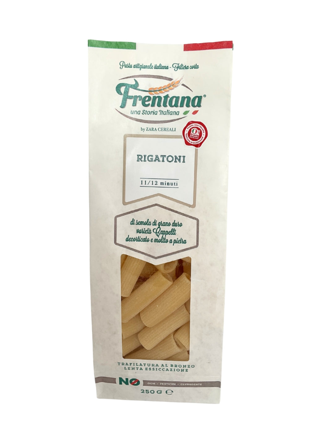 De Rigatoni van harde tarwe Senatore Cappelli van Frentana is een klassieke Italiaanse pastasoort met een kenmerkende holle, licht gebogen vorm. Deze vorm maakt Rigatoni bijzonder veelzijdig – ideaal voor stevige sauzen, ovenschotels of creatieve pastagerechten. Een echte klassieker in de Italiaanse keuken.
